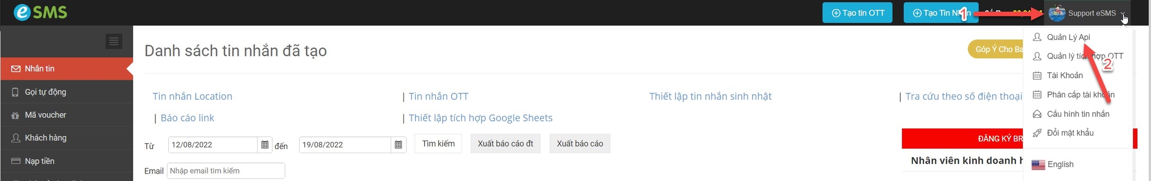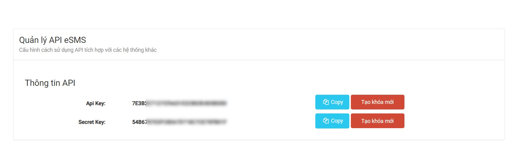 Sử dụng ApiKey và SecretKey để gửi tin, có thể tạo mới Key